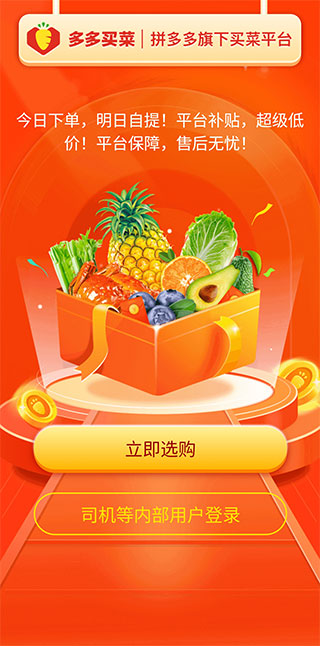 1、在本站下载安装好多多买菜司机版官方版后的,打开进入,点击“立即选购”会跳转到多多买菜页面,司机用户点击下方的“司机等内部用户登录”按钮。