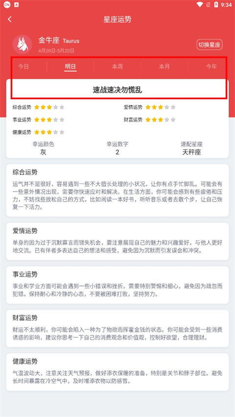 3、然后进入,可以查看到自己的综合运势、爱情运势、事业运势等;