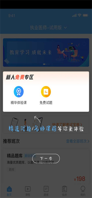 3、进入软件后,在新人免费区有精选题库和名师课程可以学习;