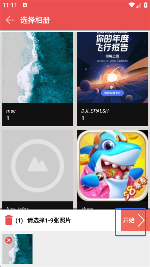 2、选择最多9张照片,点击【开始】进行制作。