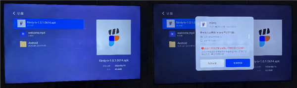 3、找到Filmly的安装包,按“确定”键进行安装,安装过程中出现确认是否安装,选择“继续安装”。