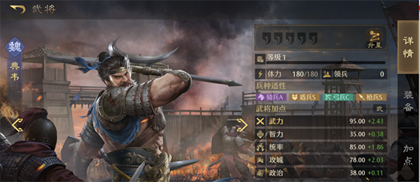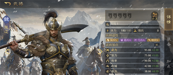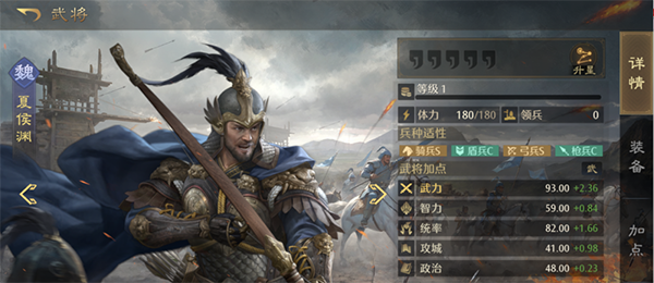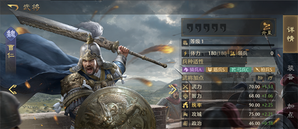 不同武将会有对各兵种的适应性数值,在武将体力条下方,会用BAS代替,兵种适应度决定了武将的属性值,适应度越高,属性值越高,如S为120%属性值,A为100%,B为80%。