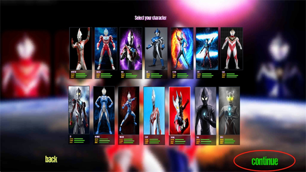 3、选择一个自己喜欢的奥特曼,然后点击右下角“continue”开始游戏