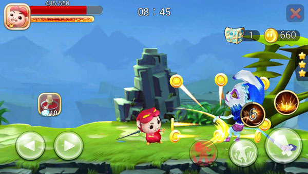 针对于游戏的玩法来说,与一般的横版闯关游戏无异,左侧控制移动,右侧依次是变身、跳跃、攻击和两个强悍的技能,其中变身需要能量,战斗连击COMBO效果非常的好,变身之后战力大幅度增强,完成关卡任务,击杀所有的敌人即可完成。