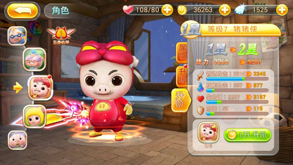 角色包含属性、等级和品阶三要素,升级、升阶可大幅度提升英雄角色的属性,但升阶更为苛刻,需要人物碎片和大量金币,但效果更佳。
