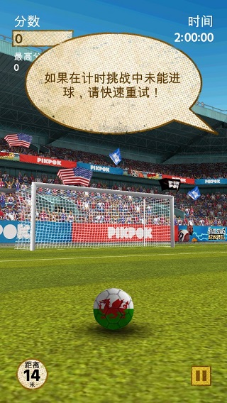 在游戏中,还有一些特殊的设定:如将球踢进靠近门柱等“死角”的“Skill Zone”就可以获得奖励或者更高的分数;当你在一次游戏中连续踢进三个球之后,你就能获得“火球”,这个球可牛B了,用这个球的话即使你的球在飞行路线上遇到障碍也能通过(门柱除外...)。