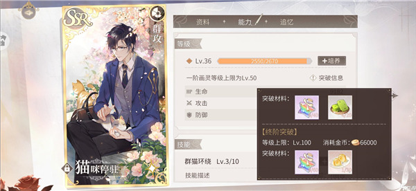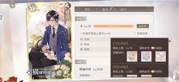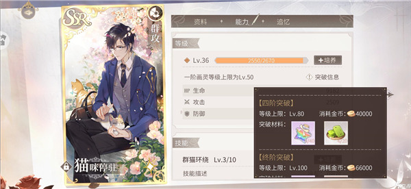 画灵的升阶需要消耗大量的材料和金币。这里以司岚的猫咪停驻为例。