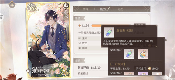 猫咪停驻从二阶升到三阶,需要消耗18000金币、20瓶中阶五色瓶、6瓶高阶五色瓶和20对珍珠耳钉。