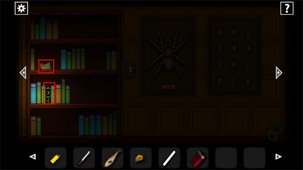 4、点卡冰箱下一层就会发现这里有着巨大无比的血印记,接着向右走,一直来到有局打蜘蛛标本的房间当中,点击书架第三层中间的书可以进行查阅,在上面可以得到密码提示。