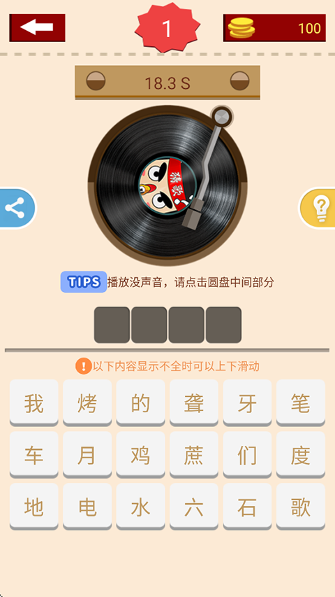 2、【闯关模式】:根据歌曲猜出歌名,每过一关奖励100金币,游戏中每隔10分钟奖励100金币,回答错误一次扣除50金币。