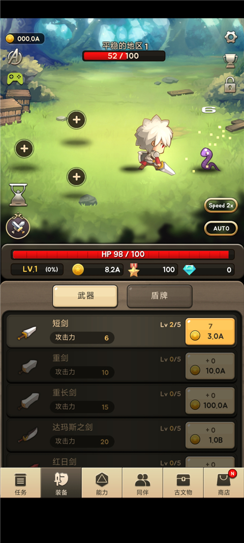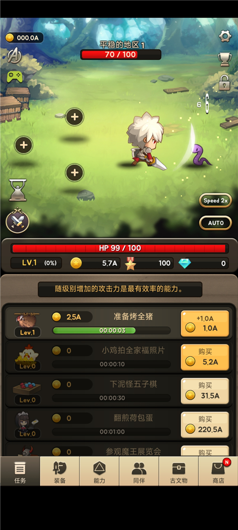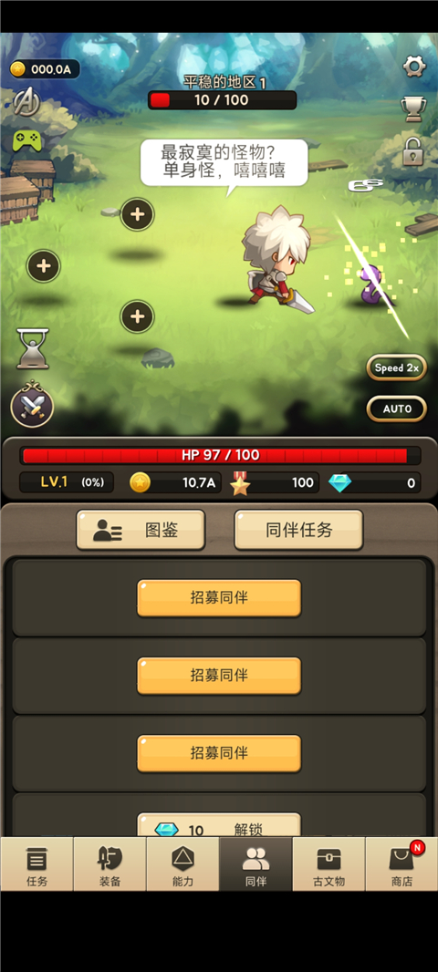 进攻之神是一款萌系挂机放置类的角色冒险游戏,一般又叫God of Attack。游戏界面非常清新,角色设计也比较萌萌哒,有点日系的意思,卡通人物的设计让整个游戏变得更加有趣和可爱。同时游戏玩法丰富,主角可以带3个同伴一起打怪,点击屏幕时主角发起一次攻击,不点的话,主角大概2秒自动砍一刀,同伴只会自动攻击,频率比主角慢,主角和怪物都会弹出对话框,甚至主角还会劝你氪点。游戏可以通过多种方式获得同伴,比如过打怪随机掉啦,悬赏通缉啦,每次最多派出3个同伴帮你打怪,这也是跟其他点击类游戏有所不同的,基本上大部分的点击类游戏,同伴都只能靠买,同伴有不同的技能,合理搭配同伴也是这个游戏的亮点之一。