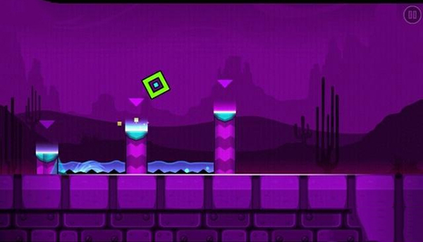 这种场景中玩家要想过关的话就需这样做,等方块跳上第一个桩子时不要点击右下角,一旦点击的话方块就会碰到上方悬挂的钉子,不点击方块就会向下落到比较矮的桩子上,