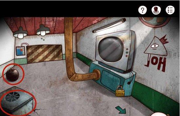 2、到达灯塔2楼,注意:左边墙上的纸里面的内容有了变化。依然是是开门的线索,但是已经变成了另外一扇门的。之后前往3楼,得到一把铁锹;之后下楼出门前往工厂,进入后捡起地上的铁球,此时可以发现左边的地上多了一个盒子(之后回来再处理)。