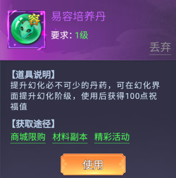 提升幻化必不可少的丹药,可在幻化界面提升幻化阶级,使用后获得100点祝福值