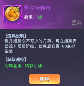 提升翅膀必不可少的丹药,可在翅膀界面提升翅膀阶级,使用后获得100点祝福值
