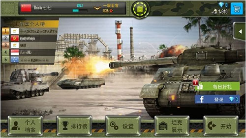 进入游戏界面,有个人档案,排行榜,设置,坦克展示和开始。旁边的红色感叹号是聊天信息,可以和外国玩家一起聊天,只是不知道在说什么。一个是世界,一个是军团的。军团要加入的话,点击世界里面邀请人的国旗后点击进入,会有团名,申请加入即可。然后才可以军团聊天。