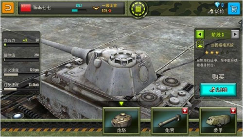 坦克展示可以提前预览你目前不可以得到的坦克。好的坦克要用钻买,要用人民币,其它的可以用军费买,军费在战斗中捡拾即可。买坦克还要等级,等到一定等级才可以买好的坦克,等级高了才可以开新图。