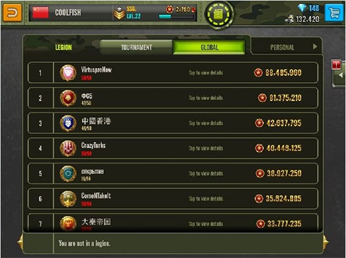 进入个人档案,有军团信息和个人信息。个人信息是你的比赛记录。军团内有职务之分,最高为军团长,次之为副团长和参谋长。进入全球排名前250名,团内成员均可获得总数为200钻的奖励,职务越高,分的越多。职务的提高靠战斗中所获得的胸章和击杀数量。