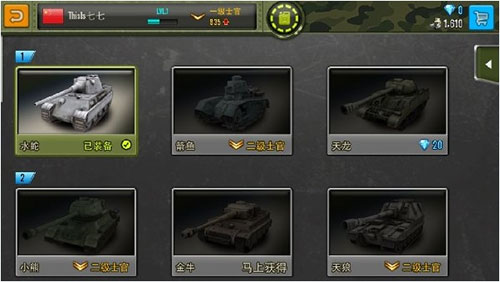 初始入门是水蛇坦克,不需要过多培养,因为我们要快速攒钱到20000军费购买箭鱼坦克,优点是行驶速度快和开火速度快,灵活性高,用箭鱼坦克在战场中多拾军费,将它升至满级一直可以用到中期,所以这里不推荐用20钻石买天龙坦克。