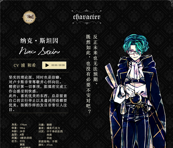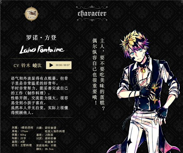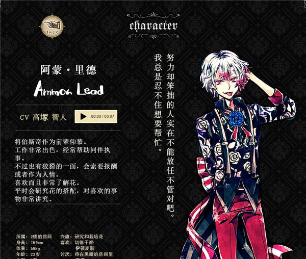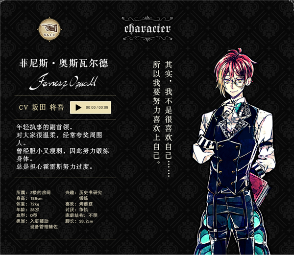 作为执事工作一流,但私生活中生活能力低下,不懂得打扫和料理。年纪执事的首领,责任感很强的完美主义性格。经常观察其他执事,把自己的事往后排。夸奖人的时候会诚恳地夸奖,斥责人的时候也会严厉斥责。不喜欢女人,交谈时会感到紧张。