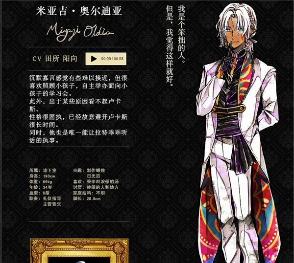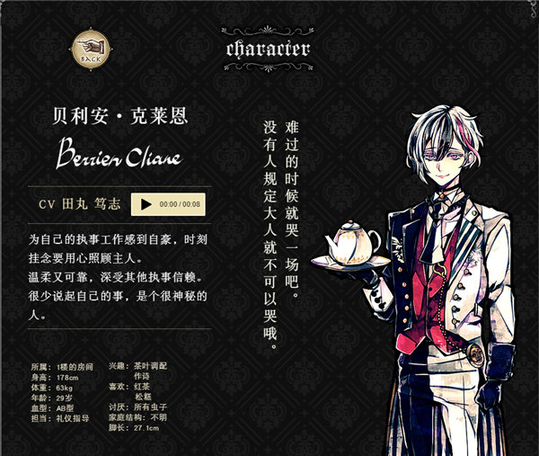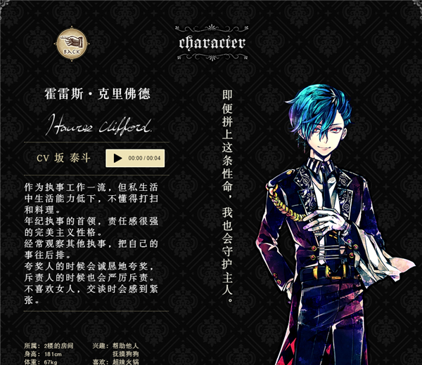 为自己的执事工作感到自豪。时刻挂念要用心照顾主人。温柔又可靠。深受其他执事信赖。很少说起自己的事,是个很神秘的人。