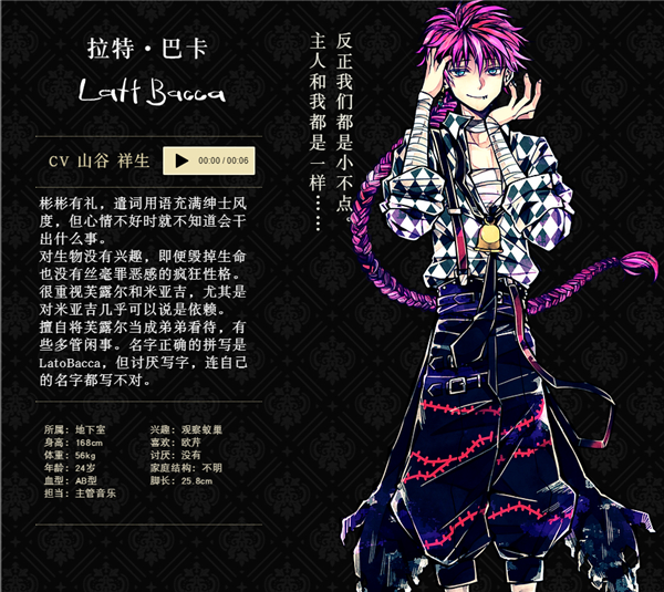 彬彬有礼,遣词用语充满绅士风度,但心情不好时就不知道会干出什么事。对生物没有兴趣,即便毁掉生命也没有丝毫罪恶感的疯狂性格。很重视芙露尔和米亚吉,尤其是对米亚吉几乎可以说是依赖。擅自将芙露尔当成弟弟看待,有些多管闲事。名字正确的拼写是LatoBacca,但讨厌写字,连自己的名字都写不对。