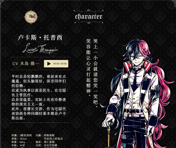 平时总是轻飘飘的,看起来有点邋遢,但头脑很好,深受同伴们的信赖。在成为执事以前是医生,在宅邸也主管医疗。总是很温柔,实际上也有冷静透彻的现实主义一面。此外,很擅长交涉,作为宅邸代表协商各种问题时基本都是卢卡斯出面。