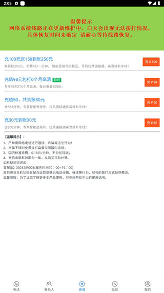 -网络电话是一款绿色软件,如果在短时间内使用网络拨打重复呼叫一个或多个号码,该用户的账号将会被冻结一段时间(10分钟到24小时),冻结期间您不能发起网络拨打呼叫。一天内若多次触犯则会延长冻结时间(超过3次则冻结24小时)。请您在拨打电话时注意。