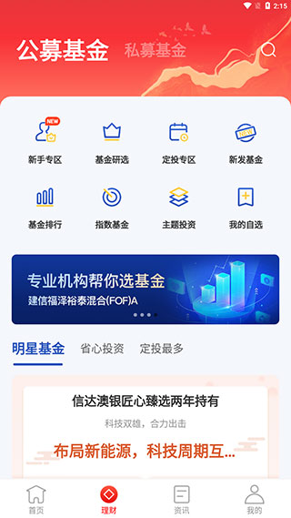 2、我们来到【理财】页面,可以更好地了解到这方面的功能内容,例如基金研选、定投专区等。