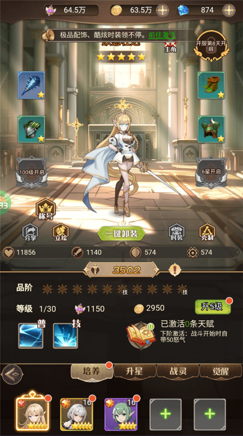 4、可为角色进行升级、装备武器