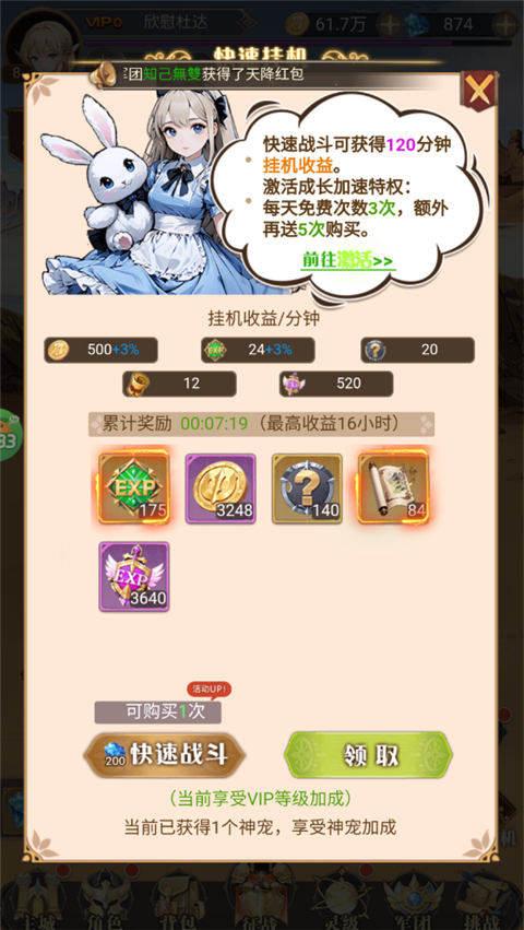 5、前往征战进行自动战斗,也可以使用快速挂机更快获得资源奖励