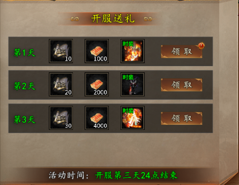 3、开服前三天登录可以领取充值卡、灵符和三套时装。