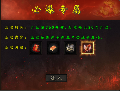 5、在开区的第360分钟内击败活动地图内刷新的三只专属怪即可获得奖励,该活动后续每天20点开启。