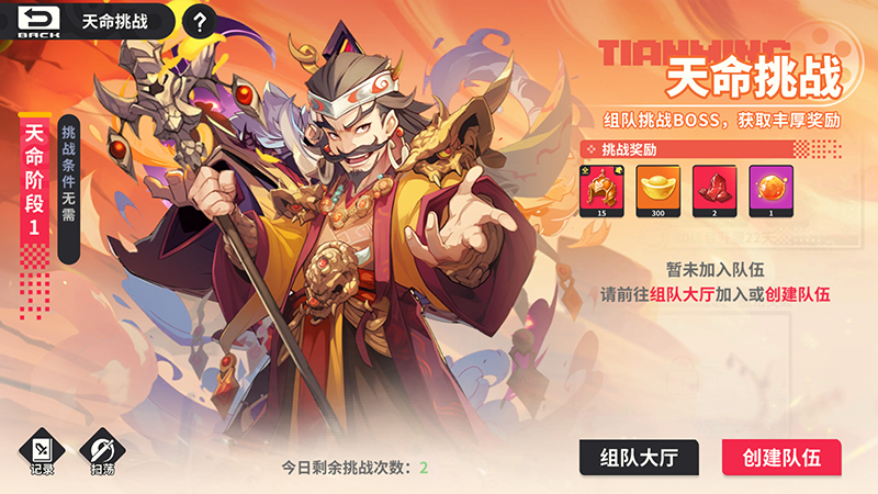 天命挑战改为组队玩法,每人需上阵2名武将进行挑战, 单人亦可挑战,丹只能上阵2名英雄,挑战难度会大大增加,所以为了丰厚的奖励,这边建议呼朋唤友,一起挑战闯关。再进一步挑战是,需要选择奇书阶级可挑战下一阶级,阶级月搞,奖励越丰富!