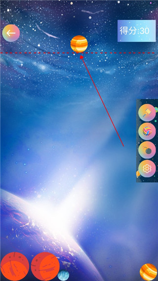 4、合并并不一定需要掉落才行,在下方两个相同的星球要是碰撞在一起也会进行消除。