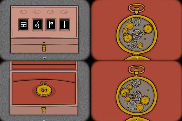 15、四个方向的星座对应的就是密码盒上的密码。往左转,密码盒在地上。输入之后打开看到一块怀表。打开怀表,调整黄色齿轮的位置使全部齿轮都转起来。