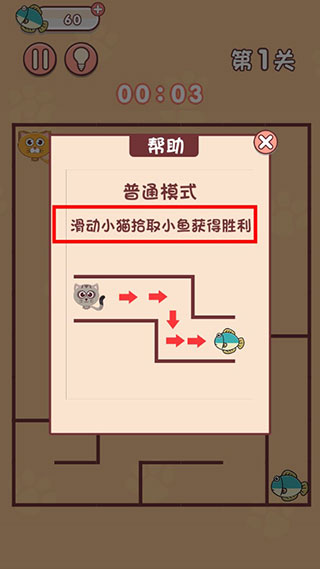 1、普通模式:滑动小猫拾取小鱼获得胜利;