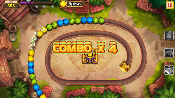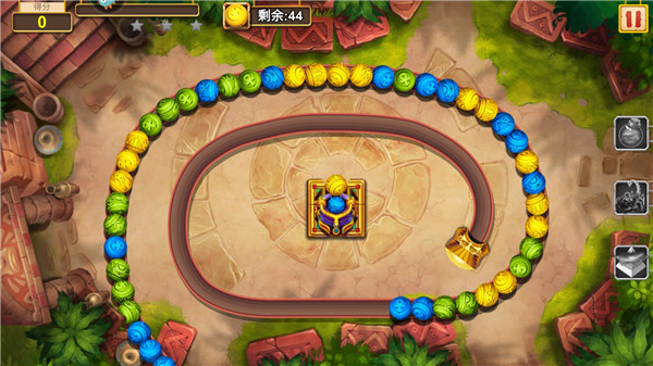 3、珠子在轨道上缓慢移动,控制炮台发射弹珠,消除粉碎相同的珠子;