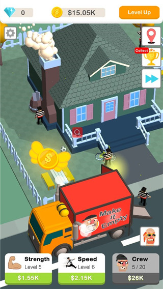 如果你是忠实的放置游戏玩家,那么不妨来试试猛男搬家游戏,英文名也叫Idle Robbery。这是一款抢劫题材模拟放置游戏,游戏中玩家需要控制劫匪,在尽可能短的时间内搬空一个场景,在警察叔叔到达之前将场景内的所有物品洗劫一空。同时猛男搬家游戏玩法一目了然,每到一个新的关卡,玩家都需要提升关卡内劫匪的数量、力量与速度,通过放置来获取收益,用收益来提升效率,进而形成良性循环,帮助玩家可以尽快完成当前关卡。不仅如此,游戏中还有随机任务、排行榜等辅助的娱乐功能,让玩家获得更好的娱乐体验。喜欢的玩家不妨下载体验一下试试看吧!
