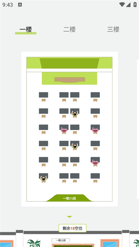 3、点击进入学习楼,总共有三层楼层,每一个班级剩余的座位会显示出来,右下角可以一键选座;
