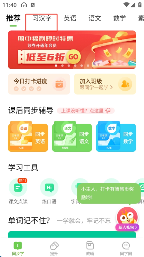 集成30余款学科工具,如字词闯关、口算检查、听力训练等,辅助学生高效完成作业和专项练习。数学学科提供思维训练工具,英语支持口语评测及绘本课程,语文涵盖作文指导和名家朗读功能,全面提升学习效率。