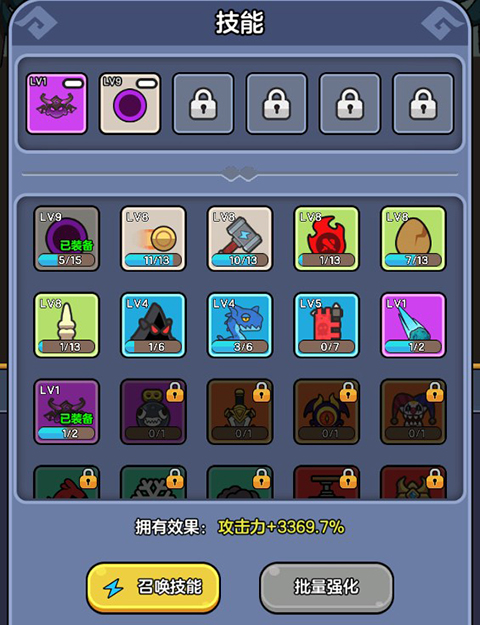 3、技能:游戏内还有各种丰富的技能,同样有普通、高级、稀有、史诗、传说、神话、超越七种类型,每种类型的技能效果各不一样,有群攻、增伤、炸弹等效果,玩家可以逐一使用,自由搭配,选择出最适合自己的一套技能体系。