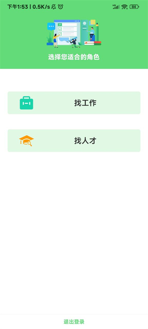 2、进入首页就可以看到该软件页面十分的清新简洁,分为求职和招聘两个板块;