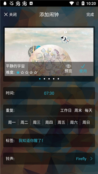 3、在设定闹钟的界面用户们可以设置闹钟“难度”、闹钟铃声、闹钟时间;