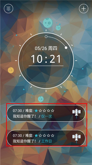 火箭闹钟app是一款十分出色的闹钟应用,该软件它不同于同类型的闹钟软件,因为在其内只要用户们设定了闹钟,那么你必须要通过不同程度的摇晃才能关闭闹钟,而不是简简单单的点击式关闭,其设定就是为了提醒用户们到时间啦、需要起床啦,听起来是不是十分的不错呢?不仅如此哦,在全新的火箭闹钟中,它为了致力于用户更好的使用感,它不但全面优化了UI界面,而且还修复了一些细节上的问题,其种种的功能旨在为你提供超酷的界面交互体验!另外,值得一提的便是软件不仅可以为自己设定闹钟,通过它用户们还可以为他人设定闹钟,但前提是其他用户在手机中也必须要拥有火箭闹钟。除此之外,火箭闹钟官方版为了彻彻底底的让你不再上班迟到、不再上学迟到,它更是支持默认运行,也就是说用户们就算关闭软件,软件也会实时的提醒你哦。心动不如行动,有需要的用户还在等什么呢,快快前来本站下载畅玩吧。