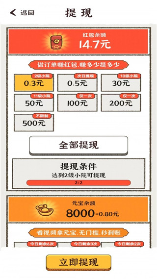 1、玩游戏赚现金,0.3元可以提现。