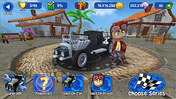 2、底部菜单第一个是修理,可以用于赛车的性能升级优化,第二个是无敌状态开启后可以不受伤害,第三个是选择车型,可以挑选喜欢的赛车型号,第四个是人物选择,不同的人物角色对应不同的特技,可以用于赛场上。然后点击”Choose Series“选择关卡。