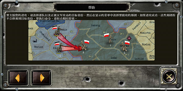 要移动或进攻,请选择部队和目标省份。然后在显示的菜单中选择要移动或进攻敌人的师团。移动或进攻的方向将在地图上以箭头显示。要执行命令,请轻点相应的按钮。
