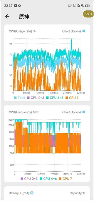 7、找到《原神》对应的任务,点击它就能看到丰富的监控信息了,包括MAX最大帧率、MIN最小帧率、AVG FPS平均帧率、VARIANCE帧速率差、≥45FPS流畅度、>46℃烫手警告、MAX最高温度和AVG平均温度,此外还更直观的帧率曲线,以及CPU占用率等曲线等。