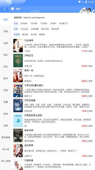 覆盖了网络上最热门的小说分类:玄幻、穿越、科幻、都市、悬疑、耽美、历史。